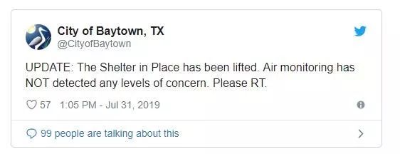 據(jù)Baytown市稱,截至下午3:05,為居住在工廠西部和330以南的居民發(fā)放的住房已經(jīng)取消,空氣監(jiān)測沒有發(fā)現(xiàn)任何關注程度。